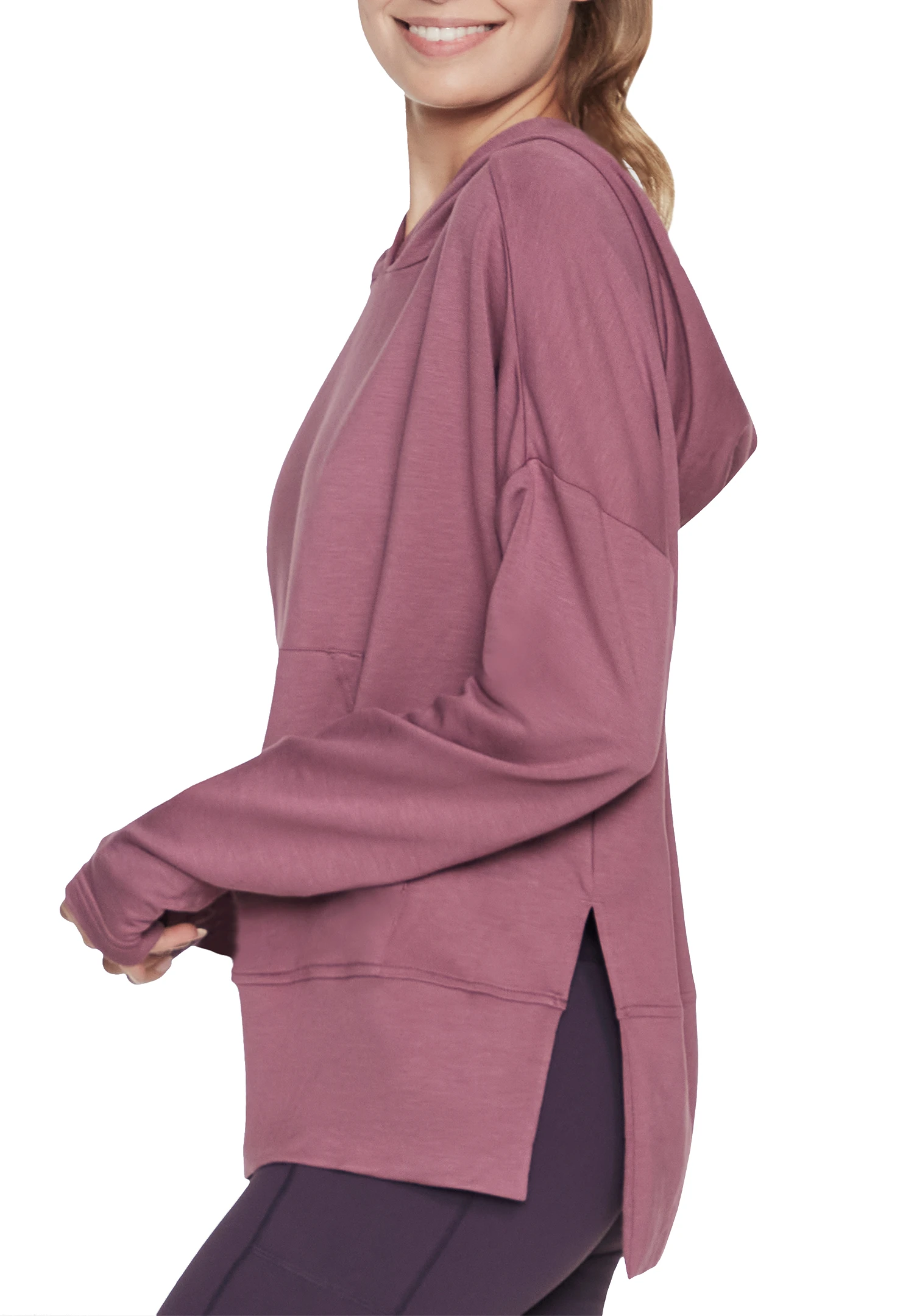 Entspann dich in lässigem Stil und mit herrlich bequemem Tragekomfort mit dem Skechers GOLOUNGE Wear SKECH-LUXE Restful Long Sleeve Hoodie. Dieser Hoodie aus weichem und seidigem SKECH-LUXE Frottee-Strick verfügt über lange Ärmel, überschnittene Schultern, eine Kängurutasche und Daumenlöcher an den Ärmelabschlüssen.